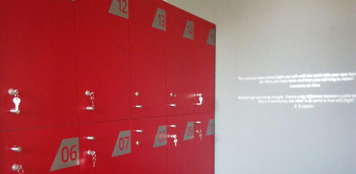 Para acondicionar la residencia en la que se instalarán los futuros pilotos, hemos diseñado la señalización manteniendo las formas y colores ya utilizados en Oxford. Materiales tan sencillos como vinilo de corte en plata, rojo y blanco para identificar habitaciones, taquillas… y placas de metacrilato combinadas con vinilo ácido para señalizar las estancias comunes. En los pasillos hemos colocado también unos aviones plateados fabricados en pvc y una vitrina de cristal con marco de aluminio como punto de información general.
