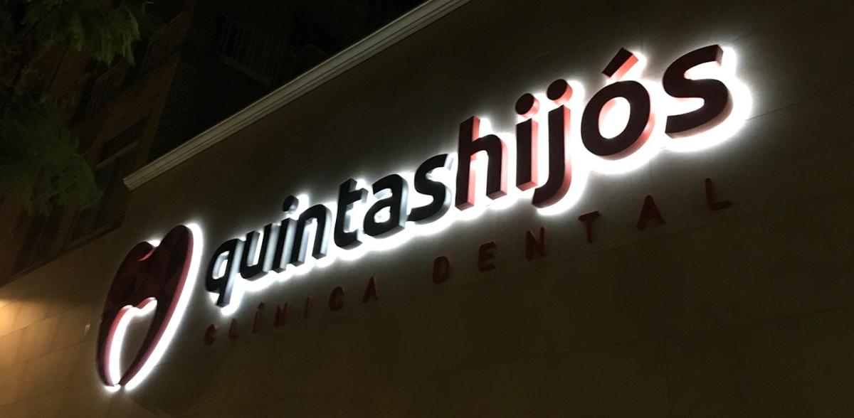 Desarrollo completo de la imagen gráfica de la clínica dental de Huesca Quintas Hijós. Diseñamos su logotipo y aplicamos su imagen y colores corporativos a papelería, vinilos para cristaleras combinando materiales de corte en color con vinilo ácido, y rótulo corpórea para la fachada compuesto por un imagotipo de gran tamaño y letras fabricadas en aluminio lacado, retroiluminado con LED, y vinilo para completar la imagen del imagotipo.