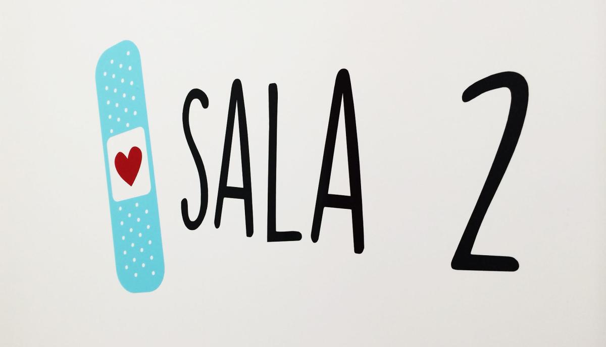 Esta gráfica y colores también se utilizaron para la señalización e identificación de las salas, en este caso con vinilo pegado sobre las puertas.