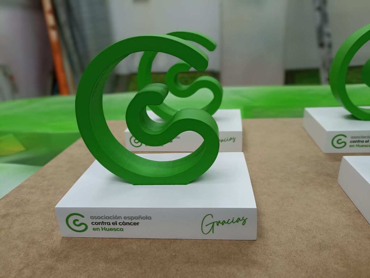 Estos han sido los trofeos que hemos creado para la asociación del cáncer, está hecho con PVC y el logo lacado y para terminar, hemos puesto impresión directa sobre la base.